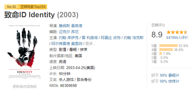 在豆瓣平台,《致命ID》被85万人打出了8.9的高分,五星好评占比超52%,好于99%的悬疑片,好于99%的惊悚片。在豆瓣电影Top250排行榜中,《致命ID》位居第92名,足见这一部经典的受欢迎程度。