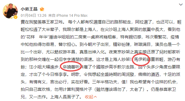 原标题:王晶夸王家卫的繁花,赞胡歌像周润发,不慎写错马伊琍辛芷蕾名字