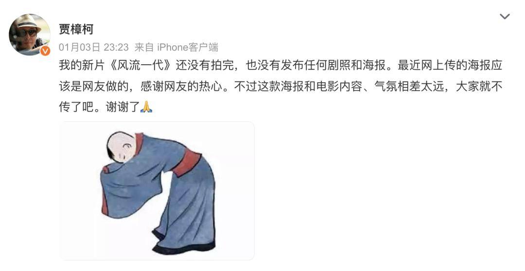 近日网上流传贾樟柯新片《风流一代》海报,导演回应:“我的新片《风流一代》还没有拍完,也没有发布任何剧照和海报。最近网上传的海报应该是网友做的,感谢网友的热心。不过这款海报和电影内容、气氛相差太远,大家就不传了吧。谢谢了。”《风流一代》以本世纪前22年为故事背景,讲述了一位中国女性如何沉默着经历了喧嚣的生活。