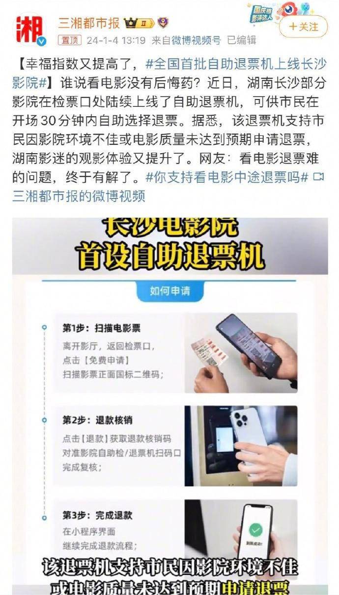 据悉,该退票机支持市民因影院环境不佳或电影质量未达到预期申请退票,湖南影迷的观影体验又提升了。网友:看电影退票难的问题,终于有解了。