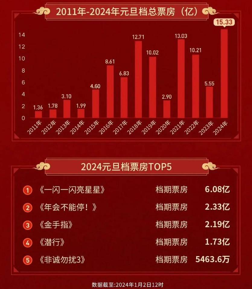 根据票务平台发布的统计数据,2024元旦档总票房15.33亿元,创下中国影史元旦档票房新高;12月31日单日票房7.32亿元,也刷新了中国影史跨年档票房纪录。