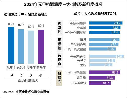 从档期三大指数来看,2024年元旦档的观赏性、思想性和传播度指数分别为83.5分、82.7分和82.1分,其中传播度在2023年调查的五个档期中居第三位,表明档期整体观影分享及传播氛围良好。