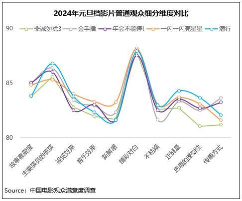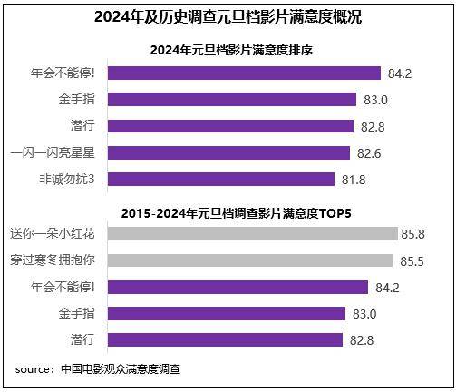 中国电影观众满意度调查・2024年元旦档调查结果显示,元旦档电影观众满意度得分83.0分,环比增长0.2分。档期以多元化且高契合度的影片供给陪伴观众跨年,得到了较高的满意度评价,5部影片中有4部进入历史调查19部元旦档影片的满意度前十,喜剧《年会不能停!》以84.2分领衔,《金手指》83.0分居第二位,《潜行》《一闪一闪亮星星》均超82分,《非诚勿扰3》超81分。