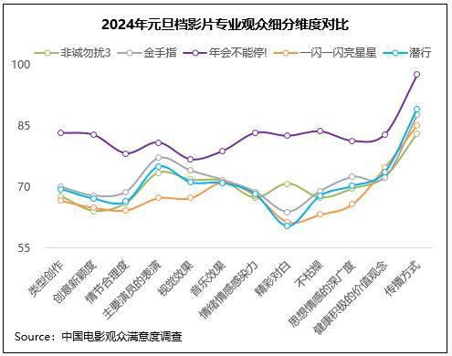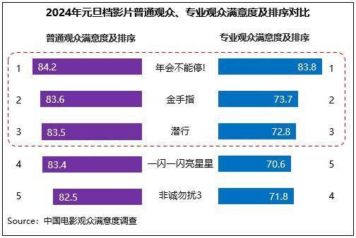 2024年元旦档调查的5部影片中,单片满意度前三的影片在普通观众和专业观众评价中的排序保持一致,而居单片满意度后两位的影片排序则有所差异,展现出不同细分观众群体的观影审美差异。