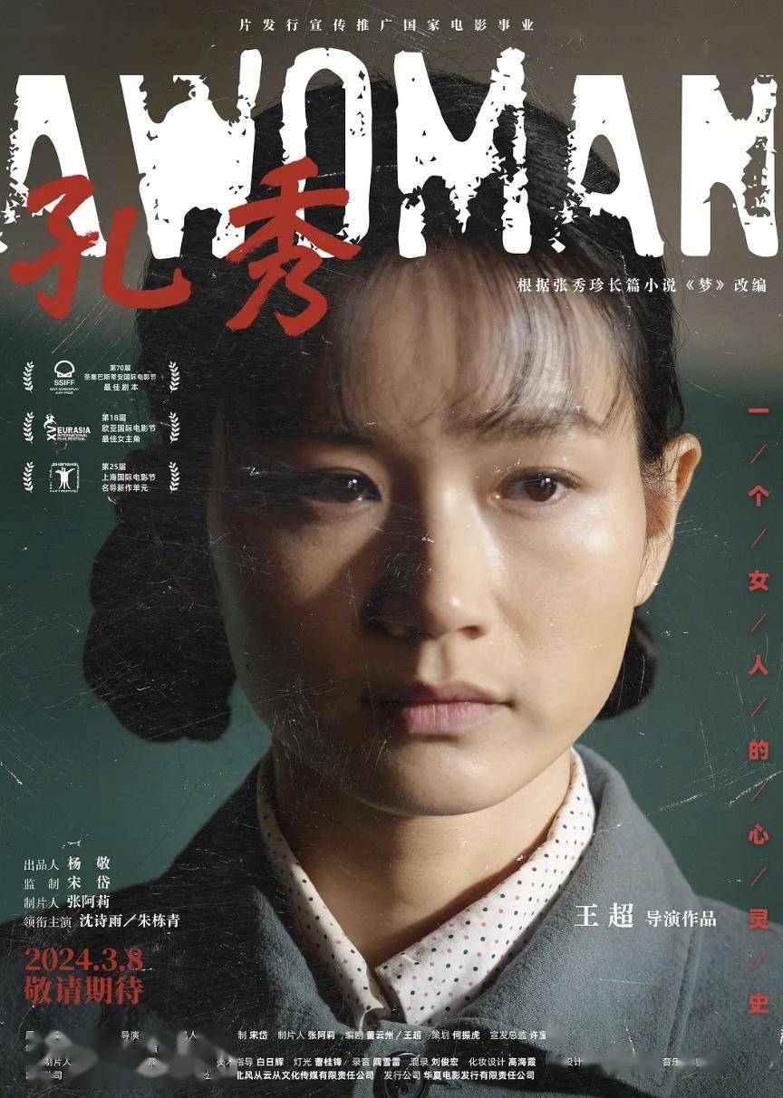 电影《孔秀》定档3月8日上映,由王超执导,沈诗雨、朱栋青主演,改编自河北作家张秀珍的长篇小说《梦》,讲述染布厂女工孔秀在两段婚姻之后,从文学当中获得给养,成为作家的故事。影片曾获得第70届圣塞巴斯蒂安国际电影节最佳编剧奖及第18届欧亚国际电影节最佳女主角。