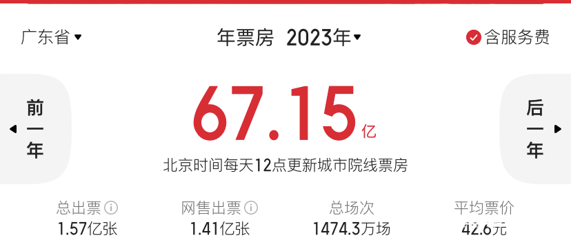 广东省2023年全年电影票房达67.15亿元。数据来源:猫眼专业版