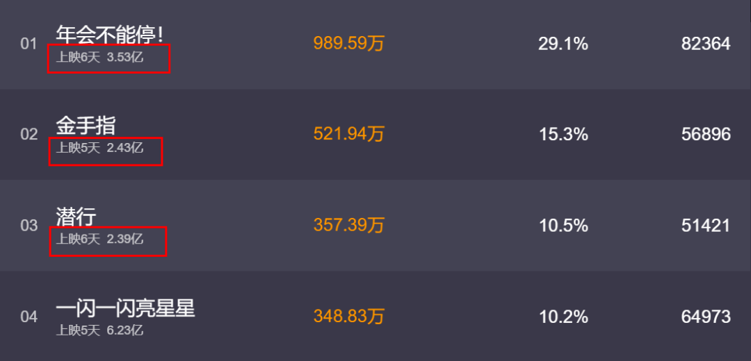 两部电影上映时间都是在五六天左右,《金手指》的票房是2.43亿,《潜行》的票房是2.39亿元,先不说比不上《一闪一闪亮晶晶》的6亿票房,也比不上“黑马”《年会不能停》。