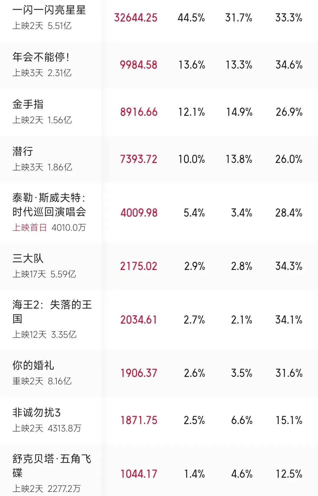流行天后泰勒·斯威夫特的演唱会实录电影《泰勒·斯威夫特:时代巡回演唱会》表现尚可,档期内两天收获4924万列第八,影片豆瓣高达9.4分,粉丝聚集的超嗨观影氛围堪称奇景。
