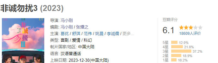 具体到影片评价上,《非诚勿扰3》豆瓣评分6.1,猫眼9.1,淘票票9.0,不算特别糟,但“悬浮”“爹味”“鸡汤”的吐槽声也不少。