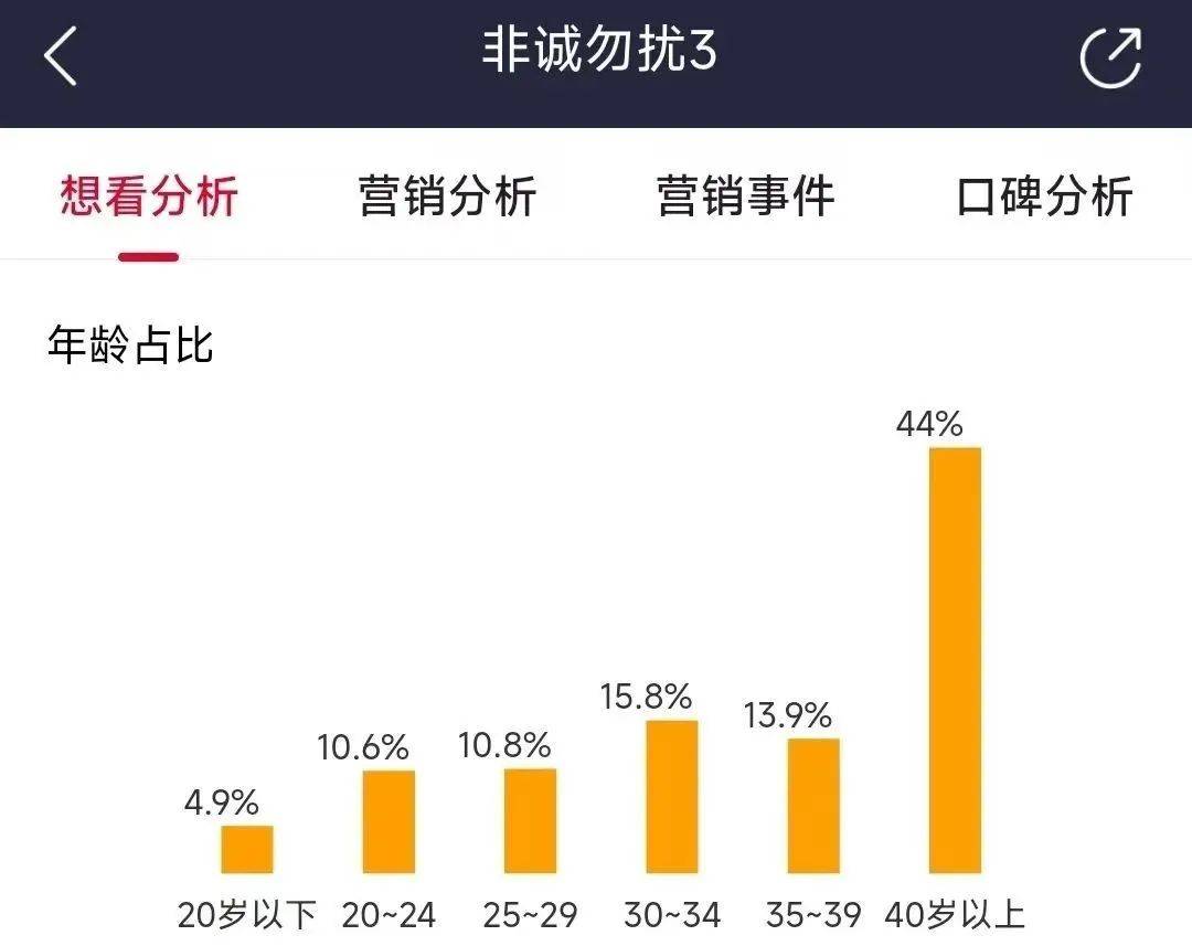 从冯小刚到葛优、舒淇,再到昔日走进电影院观看前两部《非诚勿扰》的都市白领观众,都远老于如今电影市场的观众主体了。据猫眼专业版的用户画像分析,《非诚勿扰3》的“想看用户”在40岁以上的比例高达44%,堪称“中老年人联欢”。