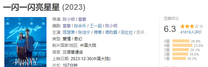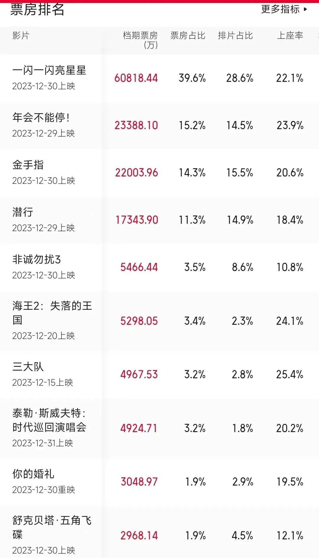 由章攀、陈小明执导,屈楚萧、张佳宁主演的浪漫爱情电影《一闪一闪亮星星》拿下6.08亿的超高成绩,强势夺得档期冠军。影片仅靠12月30至31两日票房就突破5.5亿,31日单日票房3.26亿,超越2021年12月31日《穿过寒冬拥抱你》的2.67亿,创造单片元旦档单日票房纪录。