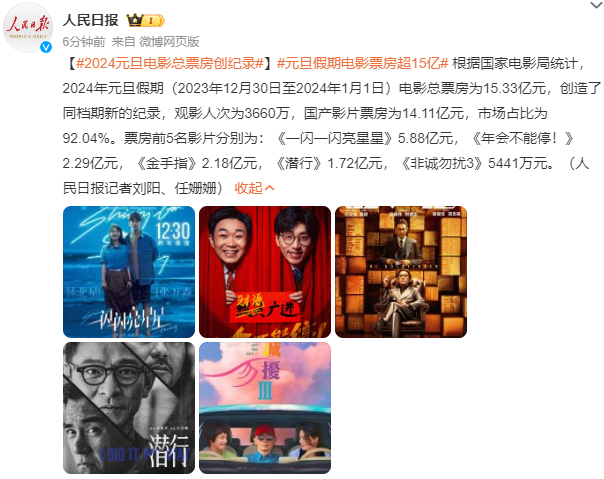 刚刚过去的跨年元旦档多头混战,堪称红红火火、热闹非凡,成功带动群众观影热情。根据国家电影局统计,2024年元旦假期(2023年12月30日至2024年1月1日),中国内地电影总票房为15.33亿元,创造了同档期新的纪录。