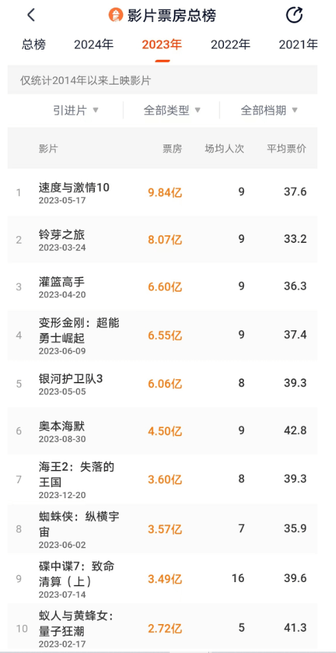 2023年引进片票房排行榜前十