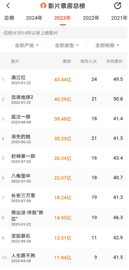 国家电影局2024年1月1日发布的数据显示,2023年我国全年电影票房为549.15亿元,其中国产影片票房为460.05亿元,占比为83.77%;城市院线观影人次为12.99亿。票房过亿元影片共73部,其中国产影片50部,票房排名前10位均为国产影片。