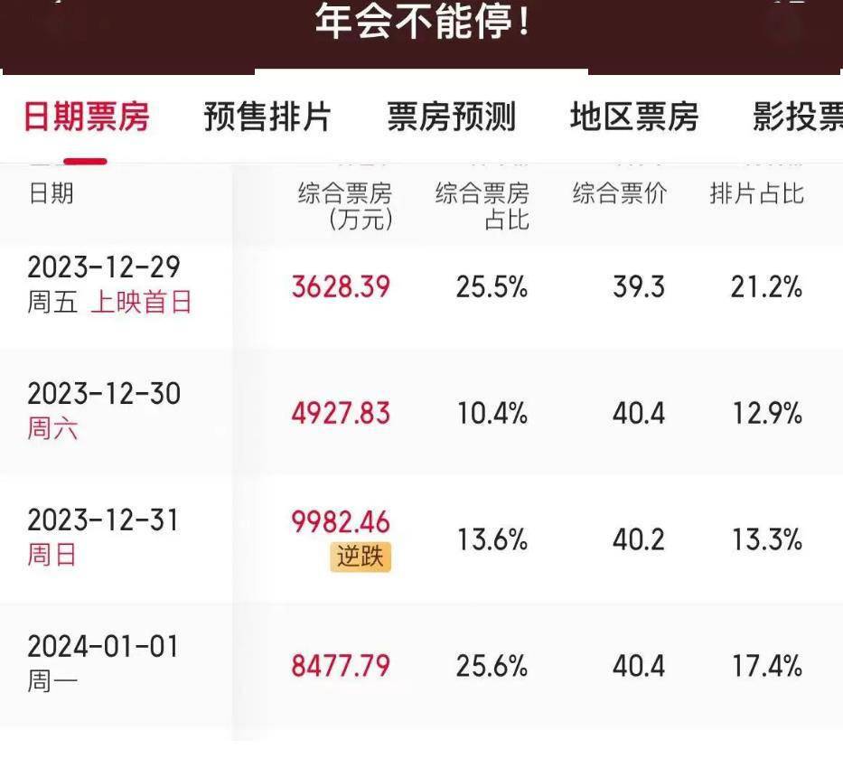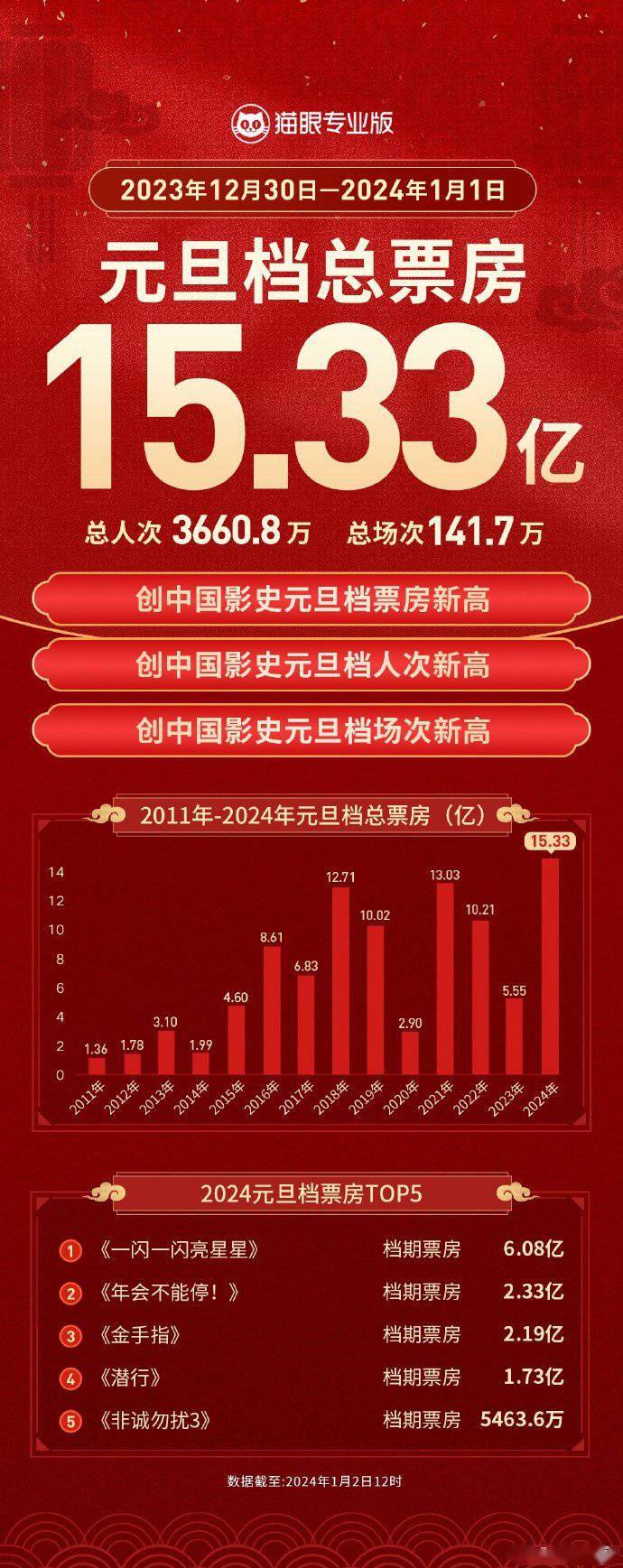 根据票务平台发布的统计数据,2024元旦档总票房报收15.33亿,创下中国影史元旦档票房新高,总场次141.7万,创中国影史元旦档总场次新高。12月31日单日票房报收7.32亿,刷新了中国影史跨年夜票房纪录。