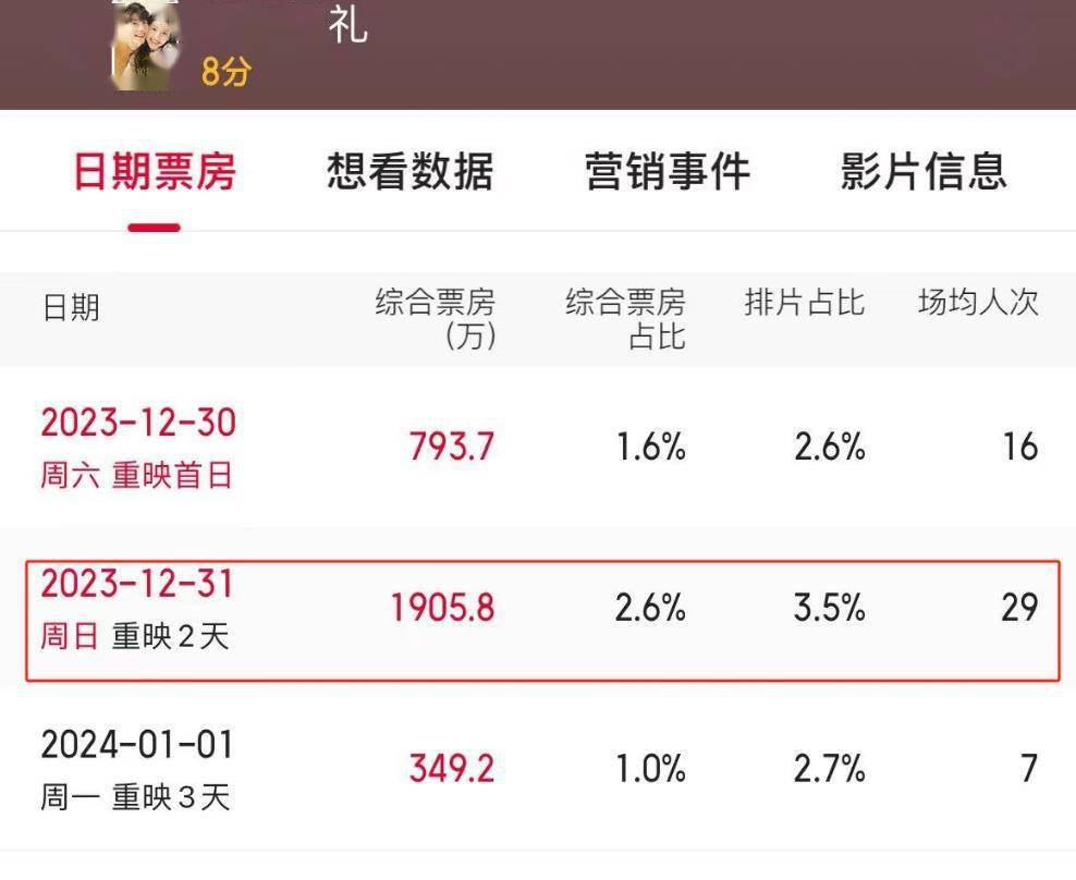 与之类似,《你的婚礼》三天票房累计3048.86万,其中近2000万票房诞生于12月31日,跨年夜的观影需求同样令这部重映影片吃尽了节日红利。