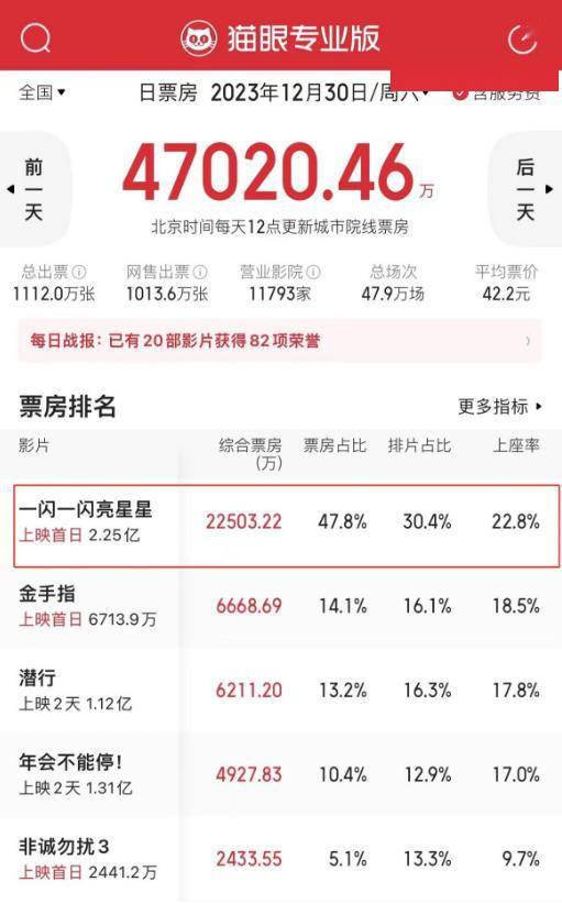 上映当天,备受期待的它占据超过30%的排片,全国1314家影城在13点14分场次的“下雪场”如约而至,特有的浪漫仪式感让《一闪一闪亮星星》首日斩获2.25亿票房,成为当日唯一一部票房破亿的影片。