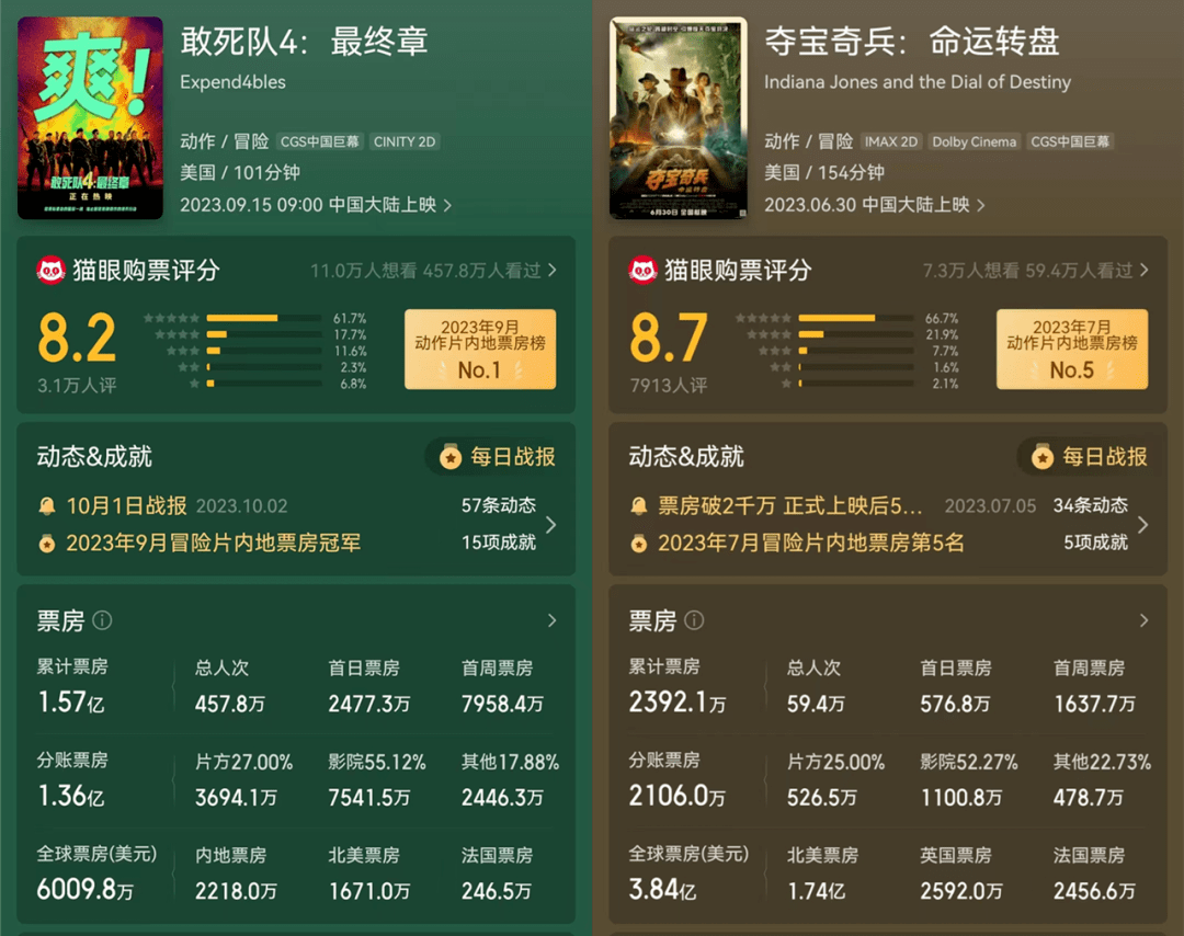 回顾2023年,不仅内地老IP不灵光,国外的老IP也不灵光。时隔多年推出续集的《敢死队4:最终章》《夺宝奇兵:命运转盘》无论是在内地,还是在北美、全球,票房表现都非常惨淡。