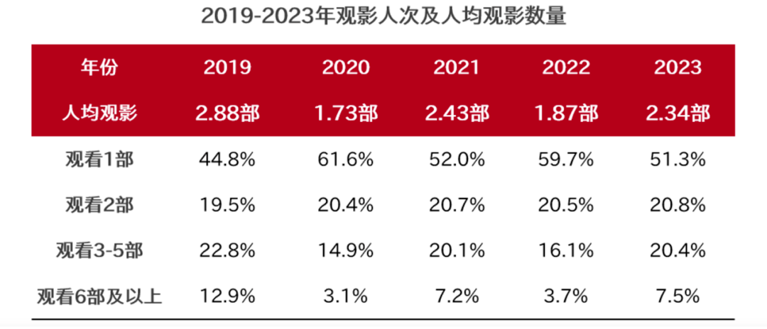 再比如,全年仅观看1部电影的观众依旧占比过半,高达51.3%。年观看6部及以上的高频次观影人群仅占7.5%,远低于2019年的12.9%。此外,像“各级城市票房占比”“各大档期票房占比”“观众在性别和年龄上的分布”等数据,相比于2019年,2023年都更接近于对近三年的延续。