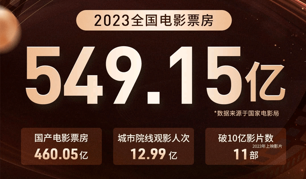 随着新的跨年档总票房纪录(12月31日单日票房7.32亿)的诞生,2023年中国院线电影市场以全年总票房549.15亿元人民币、城市院线观影12.99亿人次的成绩收官。