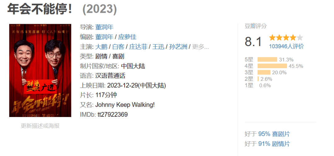 想在票房上打出精彩的逆袭,必须有好口碑的支撑。今年元旦档新片的豆瓣开分,除了纯粉丝向的《泰勒·斯威夫特:时代巡回演唱会》之外,就属《年会不能停!》的8.1分最高。其它几部均在6-7分之间。