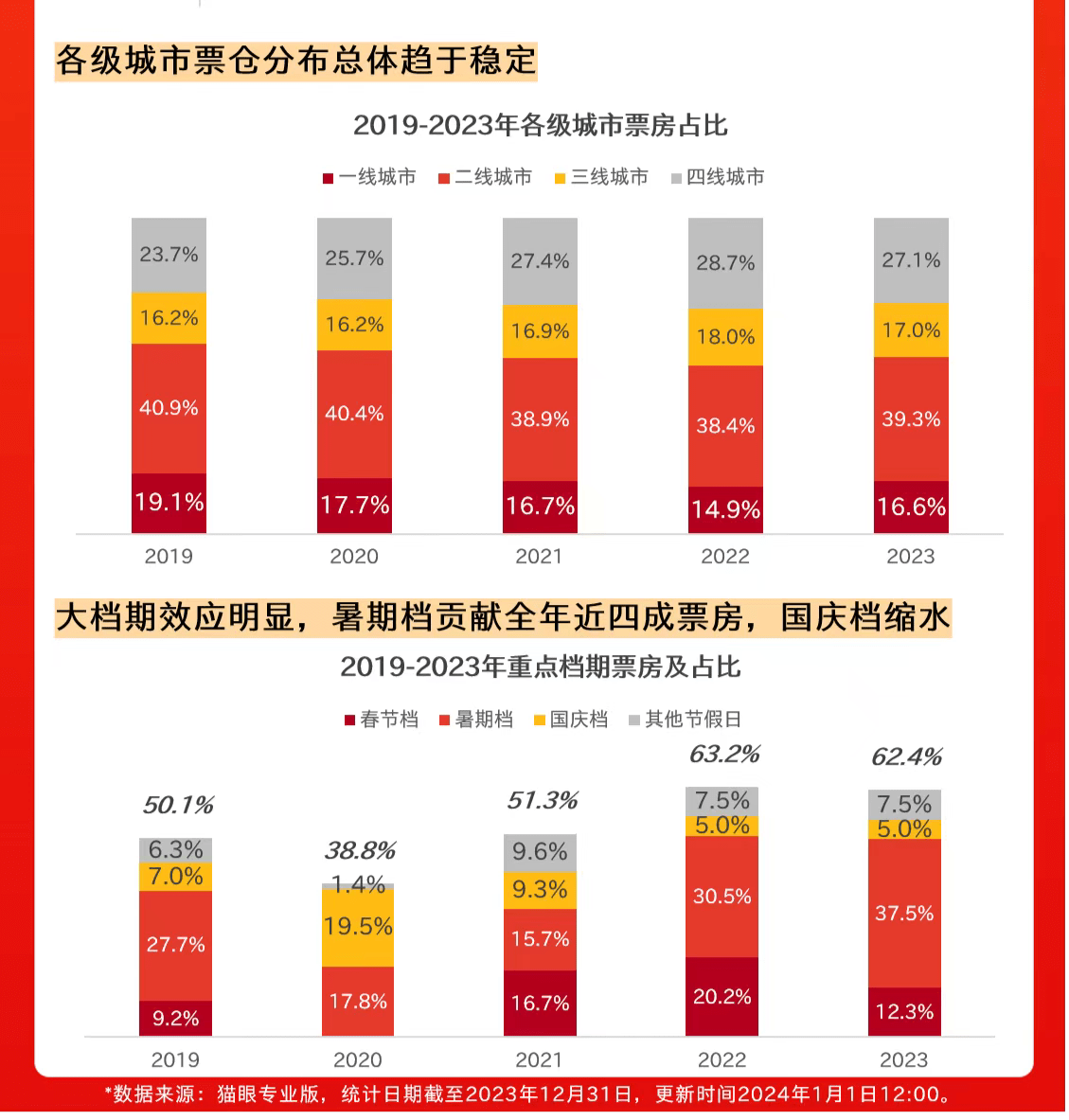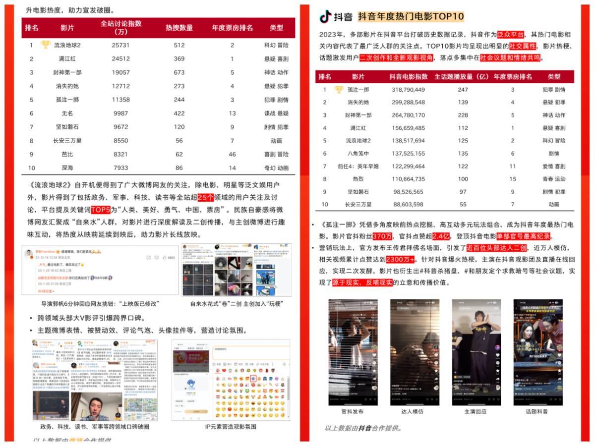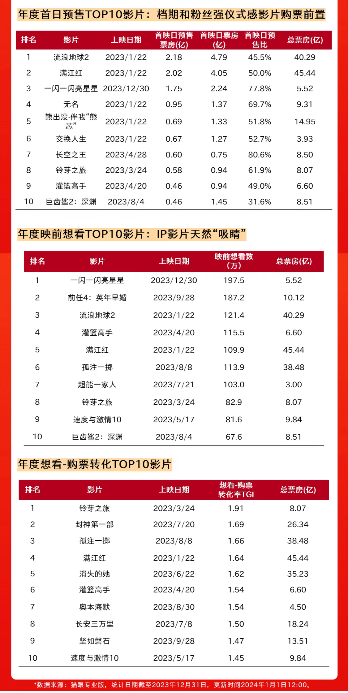 回顾2023年,中国电影市场从需求侧、供给侧及发行端,都展现出积极变化与强劲活力,彰显文娱市场的巨大韧性与潜力。在此背景下,猫眼凭借在文娱市场的长久耕耘,积淀产品及数据能力,将继续为行业全流程提供专业工具及精准数据洞察,为优质内容实现最大商业价值及社会影响力,陪伴文娱行业迈向更加繁荣的新一年。