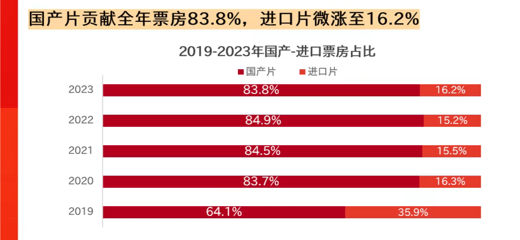首先,在供给端,国产片成为电影院的绝对主角。《报告》显示,今年国产片占总票房83.8%,全年票房过亿元影片共73部,其中国产影片50部,年度票房前10名的影片也均为国产片;相较之下,进口片2020年后日渐式微,仅占全年票房的16.2%。