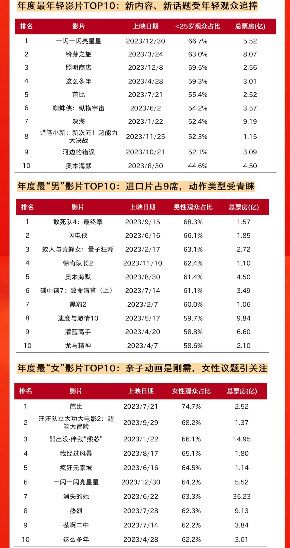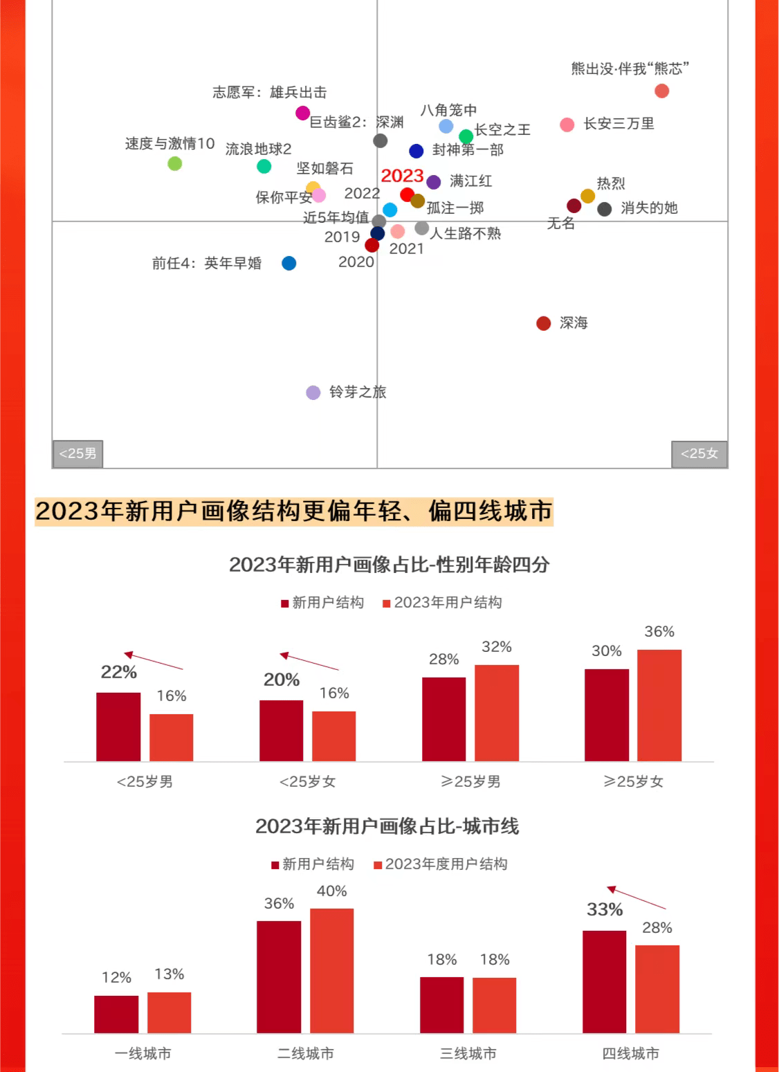 《报告》显示,2023年各级城市票仓分布总体趋于稳定,但从新用户画像结构来看,新增用户更偏年轻、偏四线城市,下沉市场持续释放消费潜力。与此同时,《熊出没·伴我“熊心》《长安三万里》《八角笼中》等具有教育及娱乐意义的影片,直观带动家庭多人观影,带动整体购票画像较往年更偏年长女性。
