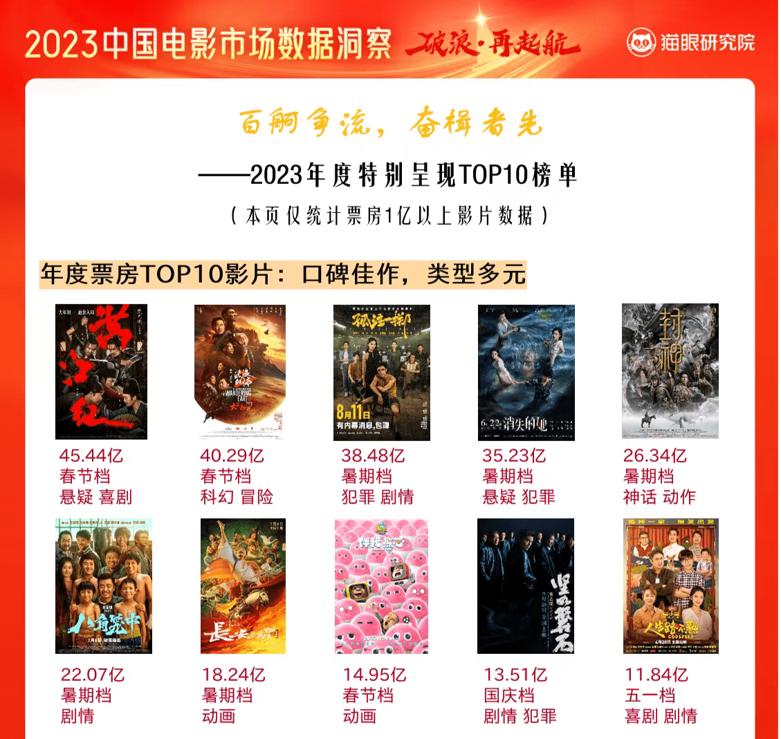 2023年,国产电影在强势崛起的进程中,题材及内容也呈现出新的特点。猫眼研究院通过猫眼大数据整合2023年电影市场TOP10榜单,从电影内容、观众、宣传、发行等不同维度,为从业者提供行业趋势洞察。