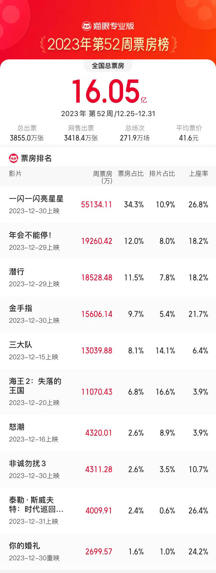 原标题:12.25-12.31内地一周票房16.05亿环比大涨125% 《一闪一闪亮星星》5.51亿夺冠