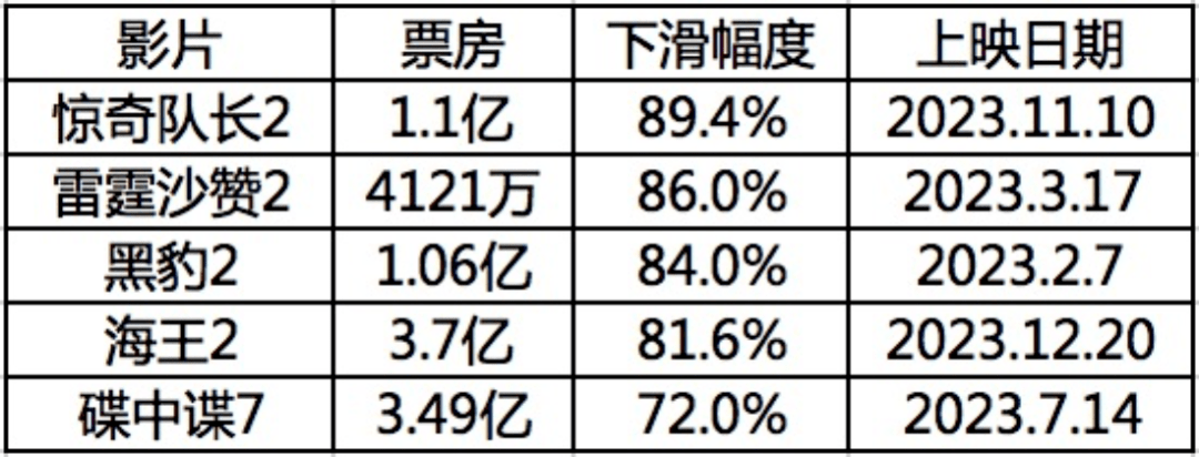这里提到了,可不再是简单的下滑,各种腰斩、膝斩,甚至“脚斩”都层出不穷,各种跌破下限的局面、始料未及的状况、闻所未闻的壮举,都在2023年发生了。好莱坞已经彻底被主流观众所淘汰,可以说疫情过后,中国观众的观影底层逻辑发生了重大的变化。