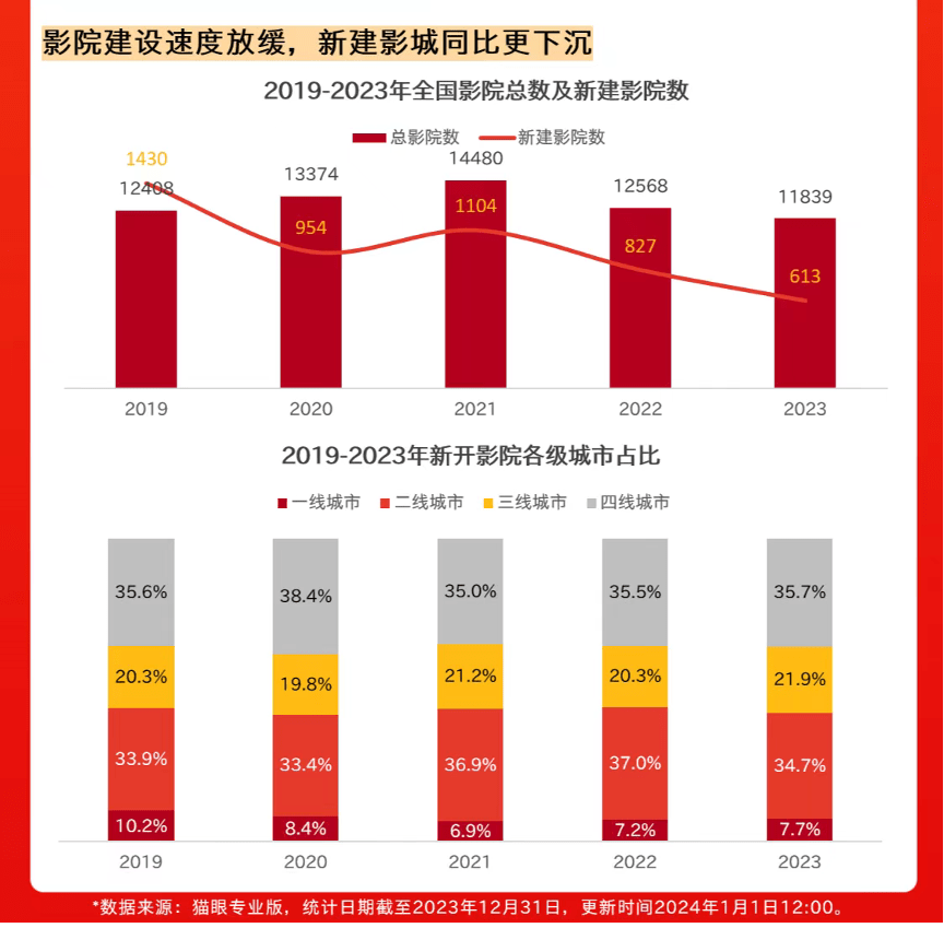 最后,在渠道端,2023年影院建设放缓,新建影城同比更下沉。据《报告》显示,2023年全国影院年度增速放缓,新建影院主要分布在低线城市。近两年间,三四线城市新开影院占比超过一二线城市,达半数以上。