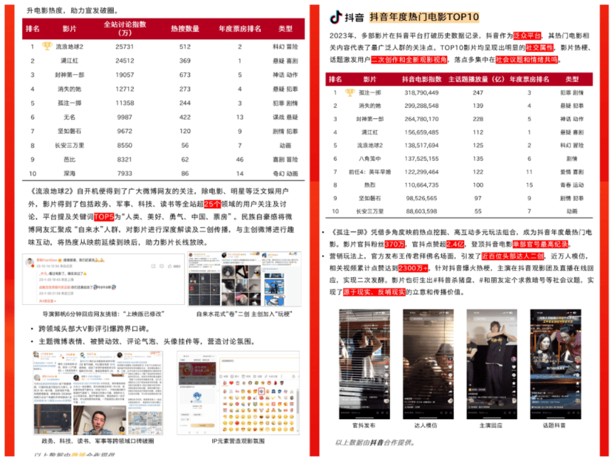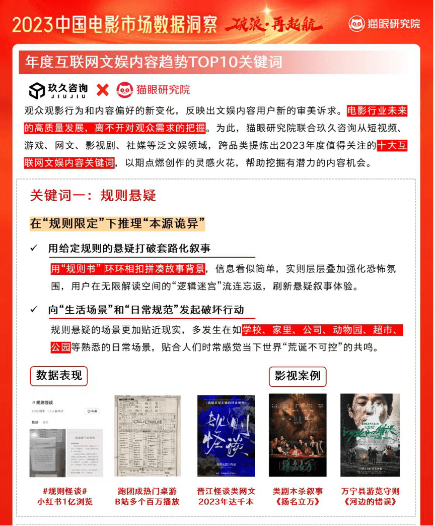 三、互联网文娱折射时代情绪,电影叙事契合社会思潮今年,猫眼研究院联合玖久咨询从短视频、游戏、网文、影视剧、社媒等泛文娱领域,跨品类提炼出2023年度值得关注的十大互联网文娱内容关键词,剖析优秀内容走红背后的底层逻辑,透视新一年内容创作风向。
