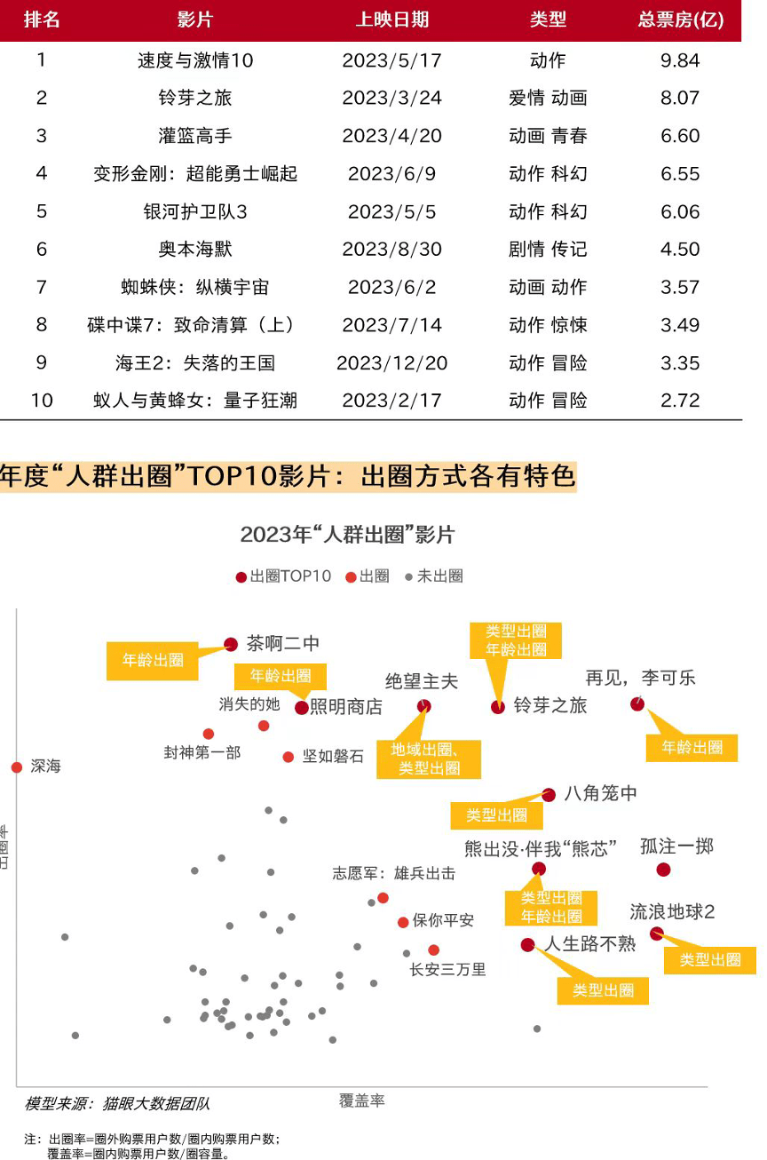 电影内容差异化背景下,IP系列电影依然展现出强大票房号召力。《报告》显示,2023年度进口TOP10影片中,7部为系列电影续作,IP影片拥有天然“吸睛”效果。但在IP电影外,国产影片也在通过不同垂直内容实现“出圈”效果,如《茶啊二中》实现年龄层面的“出圈”,《绝望主夫》在地域、类型维度“出圈”。