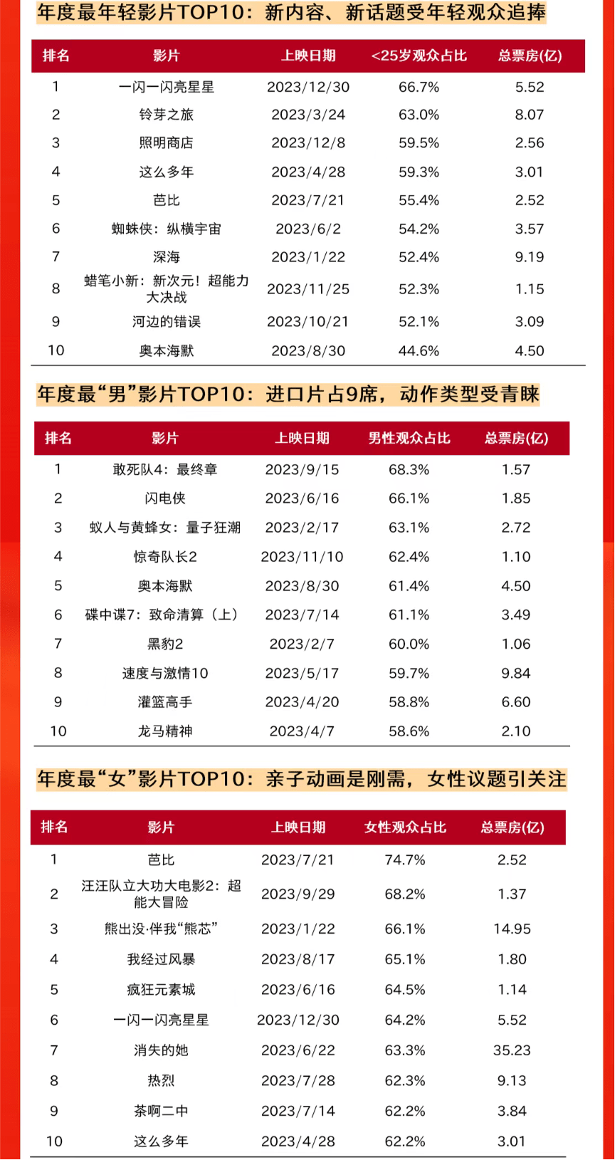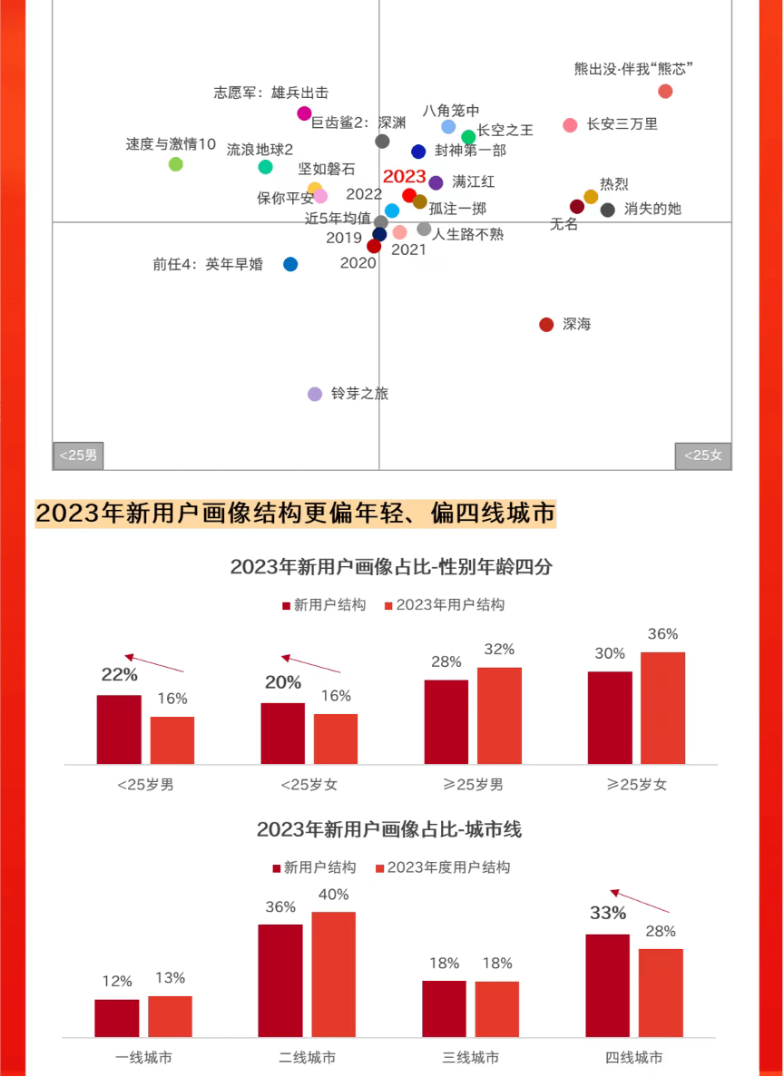 《报告》显示,2023年各级城市票仓分布总体趋于稳定,但从新用户画像结构来看,新增用户更偏年轻、偏四线城市,下沉市场持续释放消费潜力。与此同时,《熊出没·伴我“熊心》《长安三万里》《八角笼中》等具有教育及娱乐意义的影片,直观带动家庭多人观影,带动整体购票画像较往年更偏年长女性。