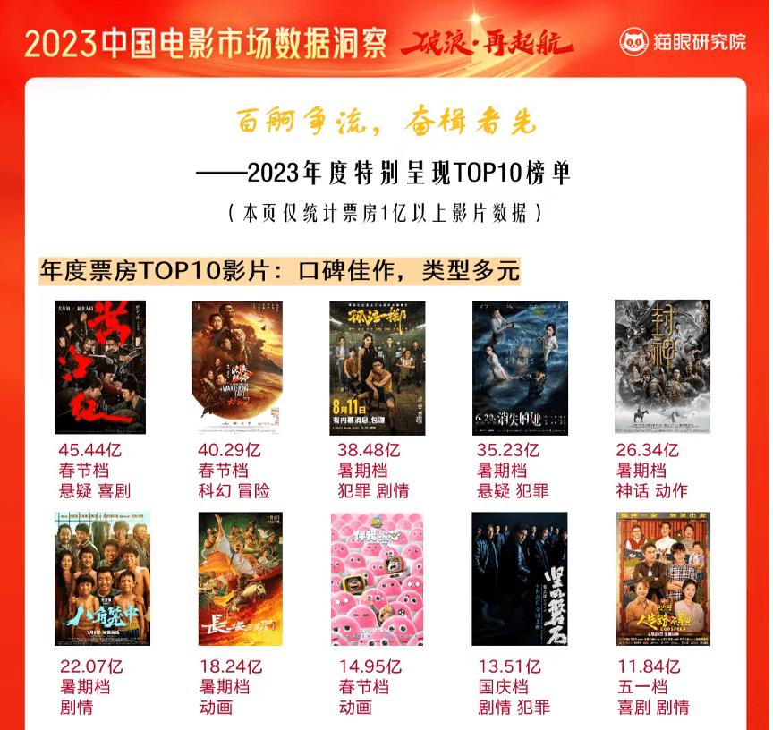 二、复合类型片大放异彩,多元内容精准宣发2023年,国产电影在强势崛起的进程中,题材及内容也呈现出新的特点。猫眼研究院通过猫眼大数据整合2023年电影市场TOP10榜单,从电影内容、观众、宣传、发行等不同维度,为从业者提供行业趋势洞察。