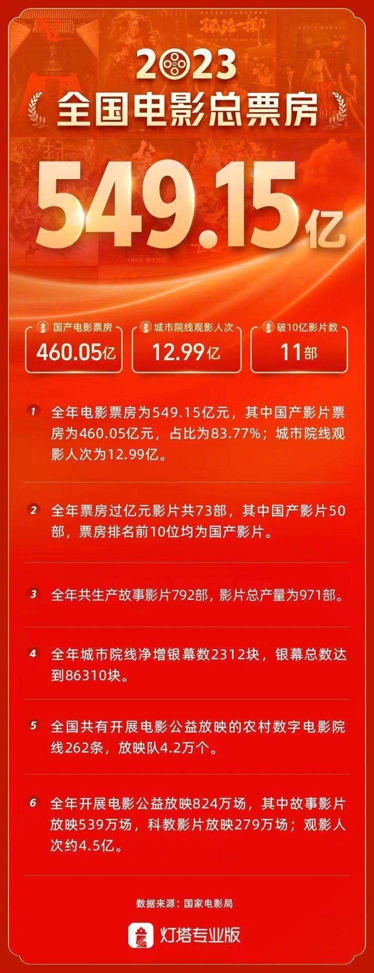 原标题:2023全年电影票房549.15亿 破10亿电影均为国产片