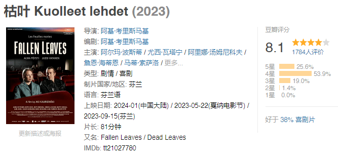 关注国外电影奖项的朋友,对这部《枯叶》可能有所耳闻。