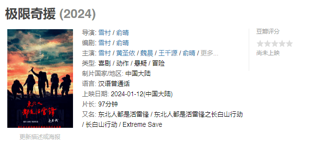 2024年1月,这部雪村和妻子俞晴自编自导的《极限奇援》虽迟但到。