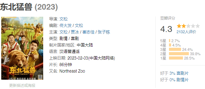 文松的《东北猛兽》,喜提4.3分。