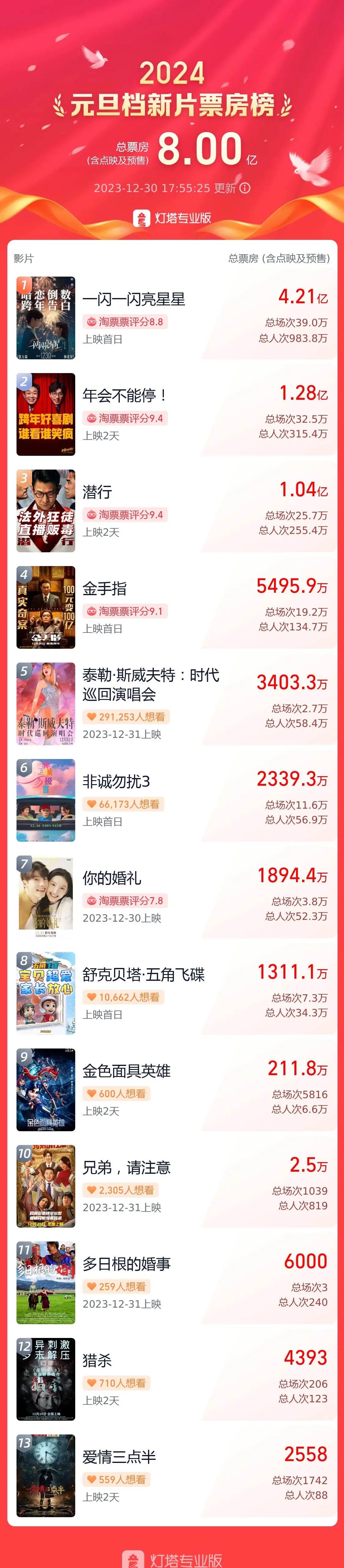 原标题:2024元旦档新片票房破8亿!《一闪一闪亮星星》领跑