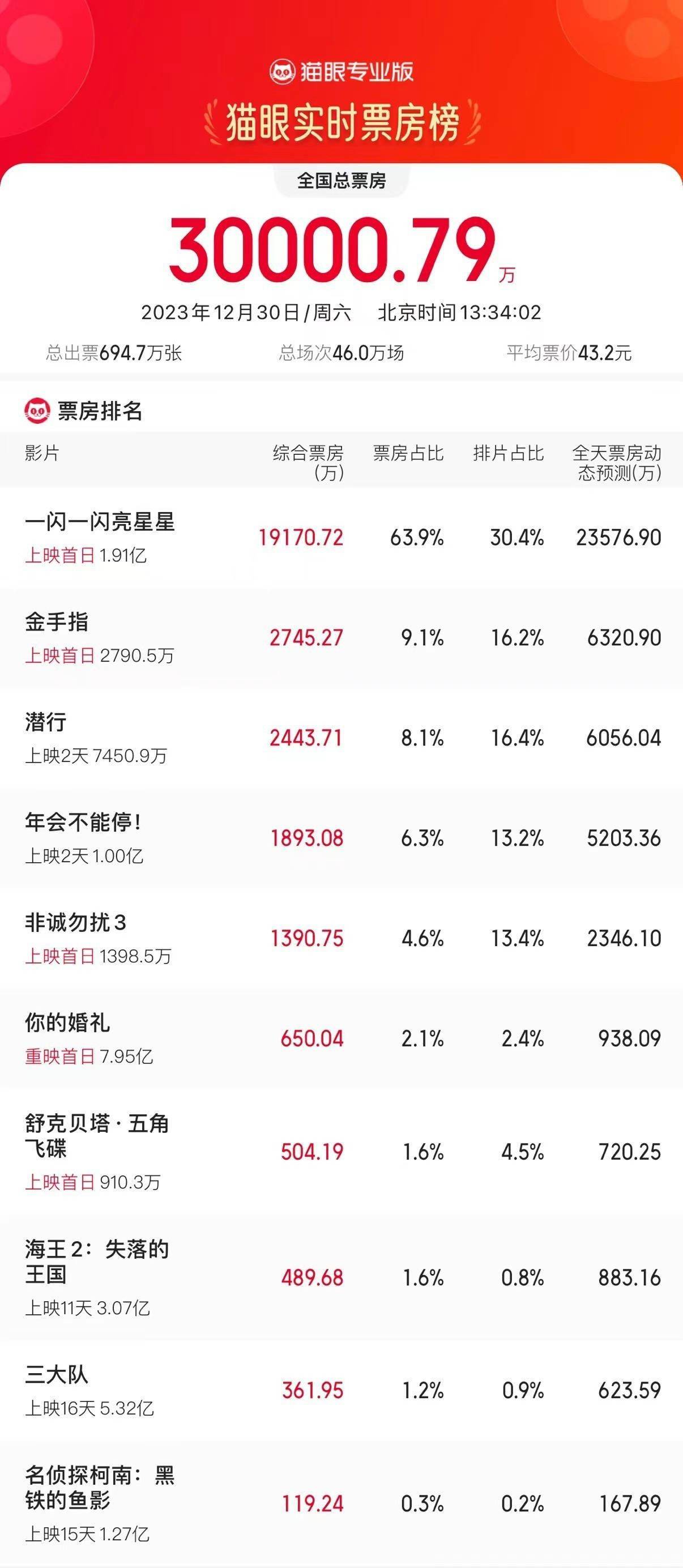 1905电影网讯据猫眼专业版数据,截至2023年12月30日13时34分,2024年元旦档首日(12月30日)总票房破3亿,分列票房榜前三位 。