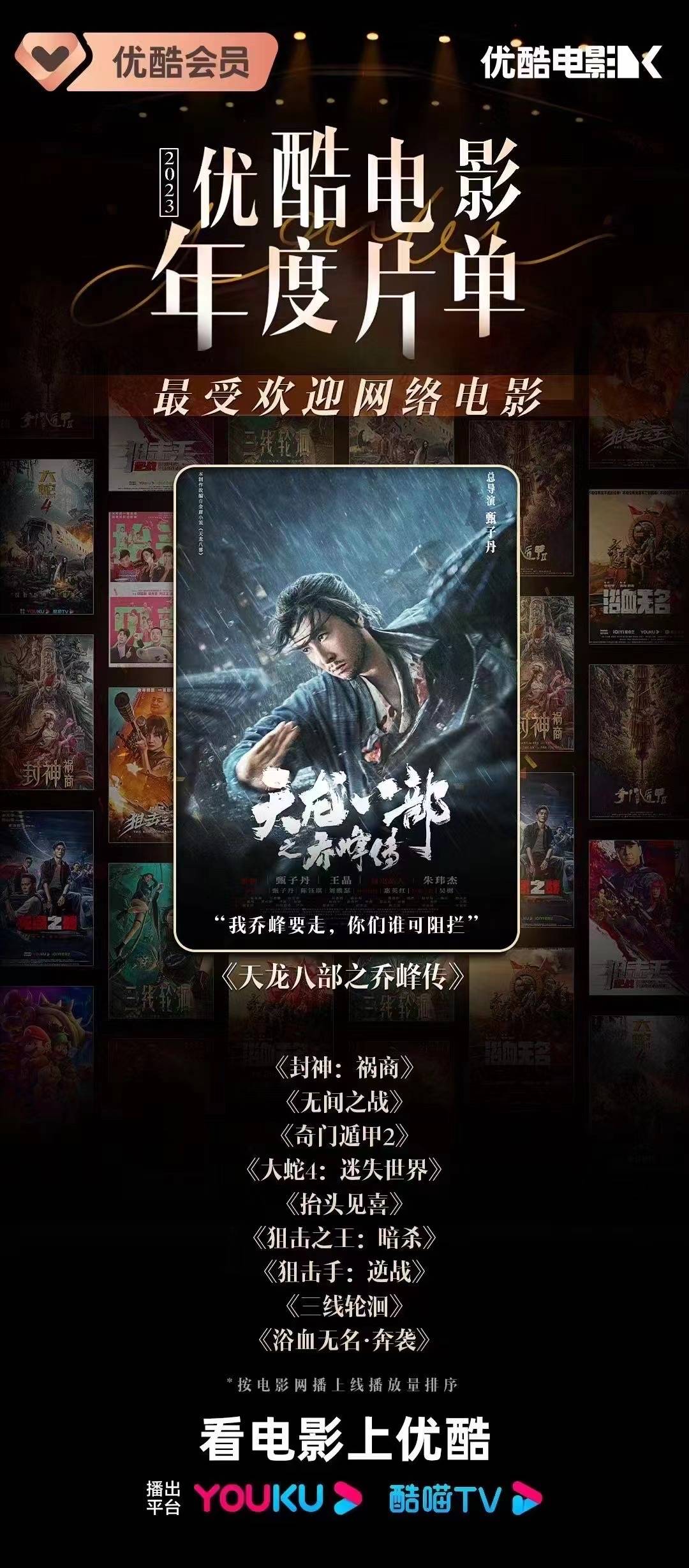 于2023年春节档上映的武侠网络电影《天龙八部之乔峰传》,在爱奇艺、腾讯视频、优酷播出后,多日蝉联三平台单片付费网络电影榜TOP1,近日更是连续斩获三平台多项荣誉,票房口碑双丰收,备受观众及市场肯定。