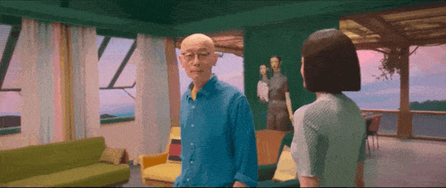 比如当AI笑笑出现在门外时,秦奋从屋内往外看,是深绿色调的布景,这个拍摄视角的选择其实很巧妙,这里的墨绿色压抑而阴郁,映射了秦奋的心情是孤独黯淡的。