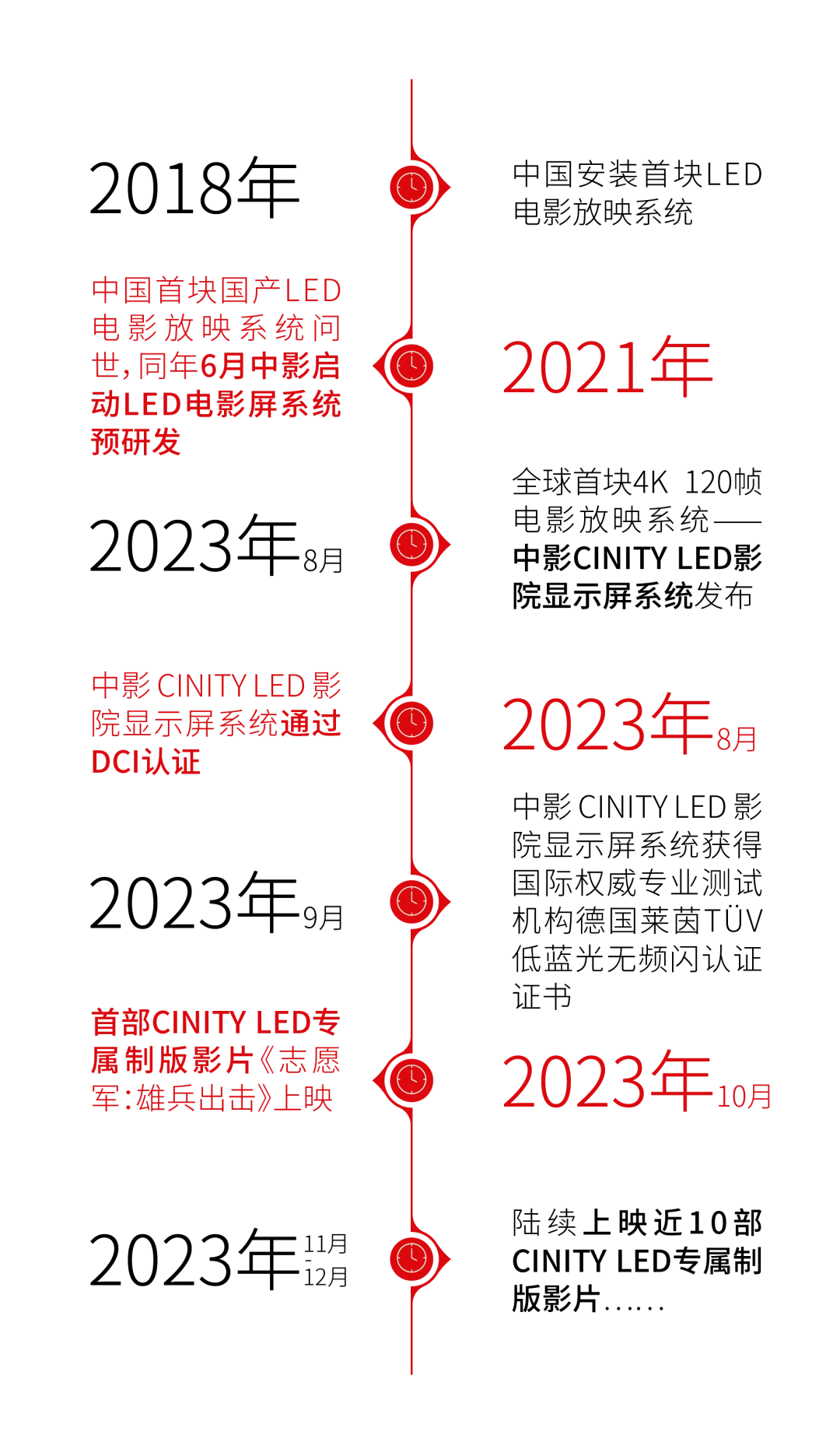 2023年9月,中影组建了国内首个高于DCI规范的LED电影制版实验室,并于同月与电影主创团队共同完成了国内首部高格式电影《志愿军:雄兵出击》的LED制版,该片于十一档上映。CINITY LED的专属制版,确保了这部电影上映时能在LED放映系统上真实还原导演及主创团队的视觉表达意图,给观众带来最佳画面体验和艺术视觉感受。