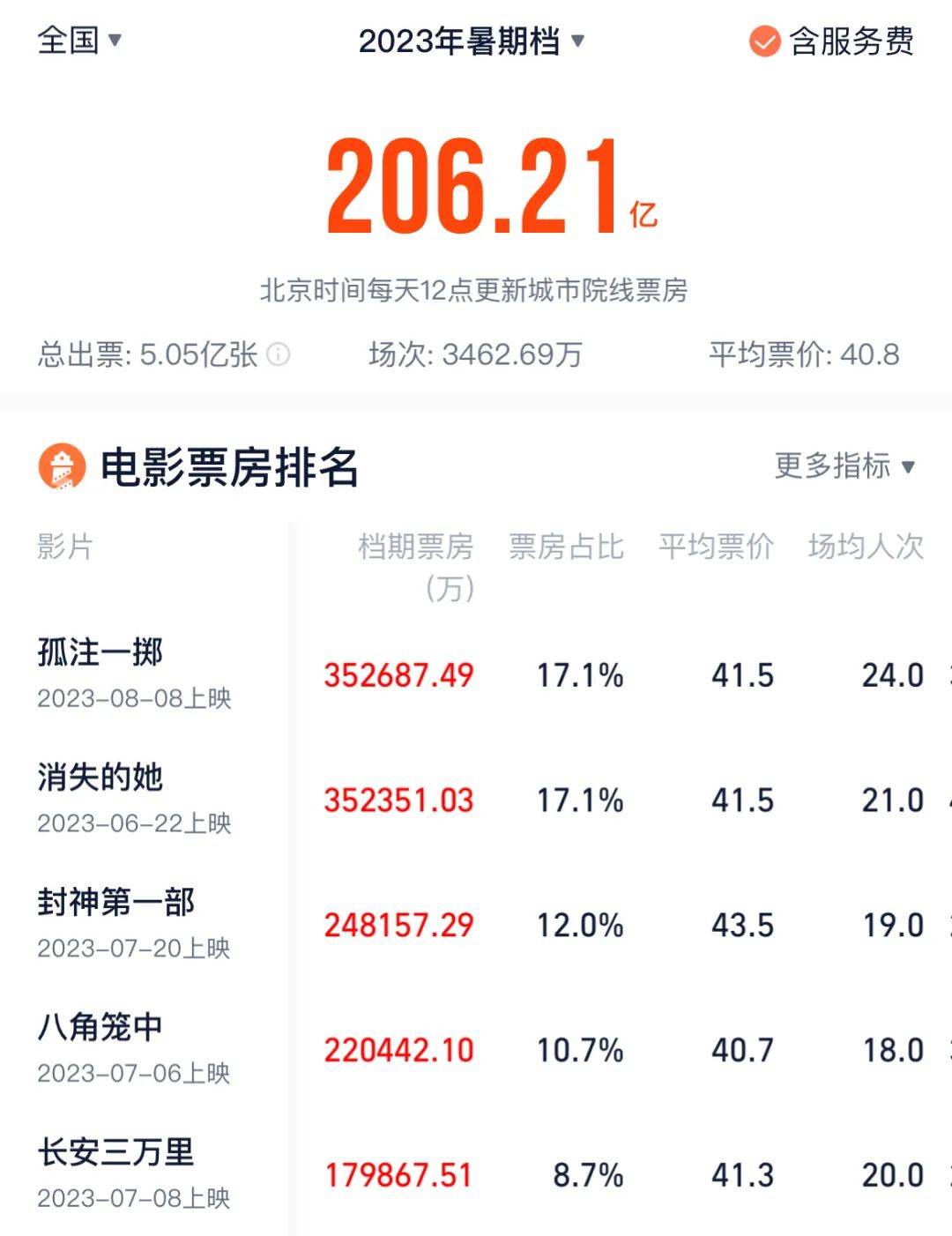 年度票房排名第三到第七位的恰好都是暑期档的“五大黑马”——《孤注一掷》(38.4亿)《消失的她》(35.2亿)《封神第一部》(26.3亿)《八角笼中》(22亿)《长安三万里》(18.2亿)。