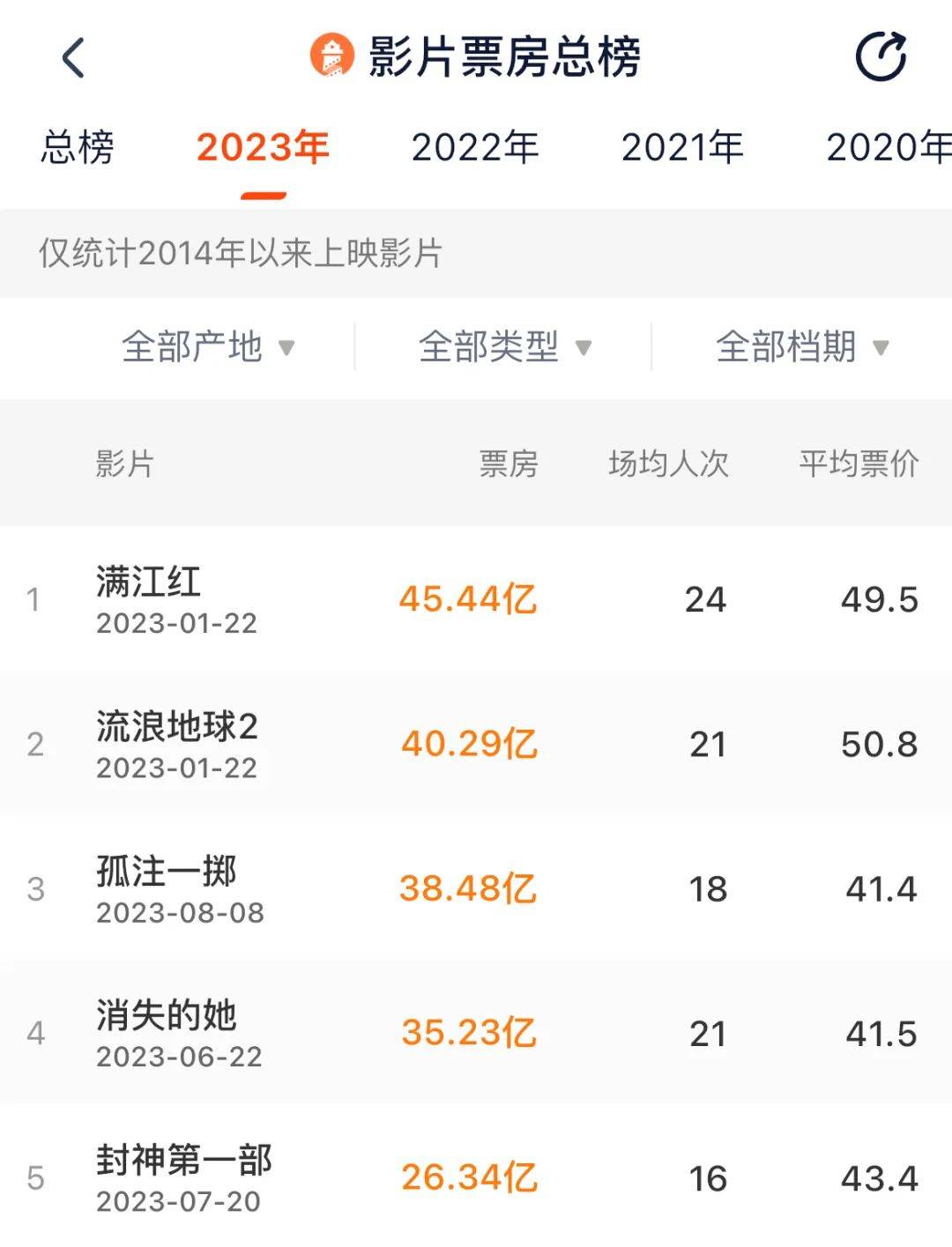 春节档的两个头部片《满江红》(45.4亿)和《流浪地球2》(40.3亿)也当仁不让地成为了今年票房的TOP2,也是国内影史票房的第六名和第十名。