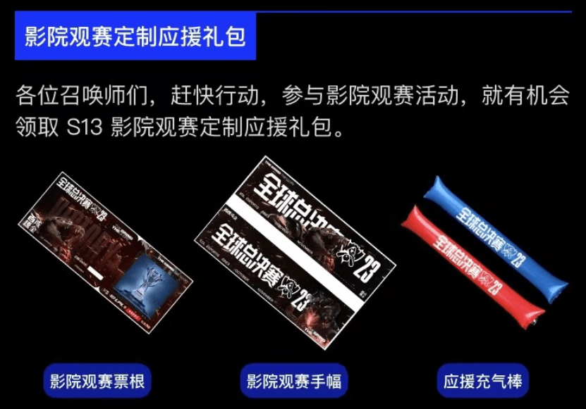 今年的英雄联盟全球总决赛举行期间,多家影院就举办了观赛活动,观赛票和普通的电影票价格差不多,但是除了可以与好友一起在视听效果更好的大银幕上感受电竞赛事氛围外,还可以领取专属的影院观赛定制应援礼包,活动的体验感满满。