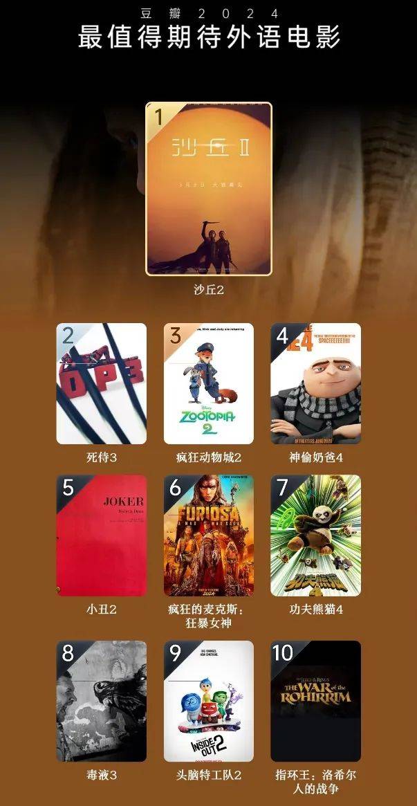 今年豆瓣年度影视榜单中,2024最值得期待的外语电影里竟全部都是IP向续作。大众一边期待着优质IP的海量内容供给,一边嫌厌着粘贴复制的过时故事。观众呼唤的东西一直都只有一个,好的故事与好的电影内容。