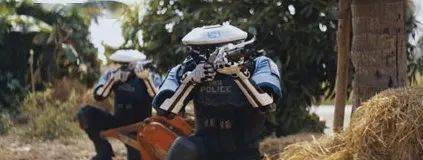 《AI创世者》剧照:仿生人警察包围一名敌方战斗人员。